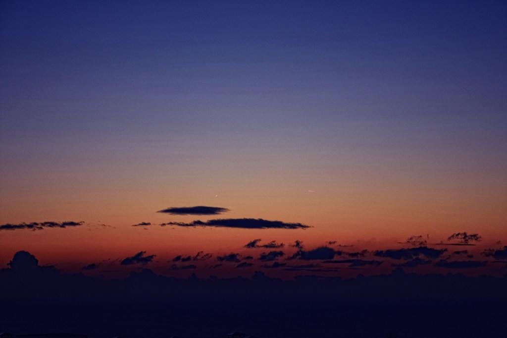 Само няколко минути по-късно обаче, миг преди да изгрее любимата му, то прибра в себе си всички цветове. И замлъкна. И стана тихо, меко, пастелно и леко носталгично. Пред мен изникна образа на художник, чезнещ по музата, внезапно напуснала го. Сякаш бе взел назаем небосвода, наместо платно, и рисуваше картина на самотата си. Изключително пестелив в светлосенките, предпазливо посягащ към силните тонове, мацващ ги само колкото да провери как биха преподредили света му. И същевременно толкова дълбок и копреещ за преобръщане изотвътре устрем. Пленена бях! Самотата му бе толкова възхитителна!